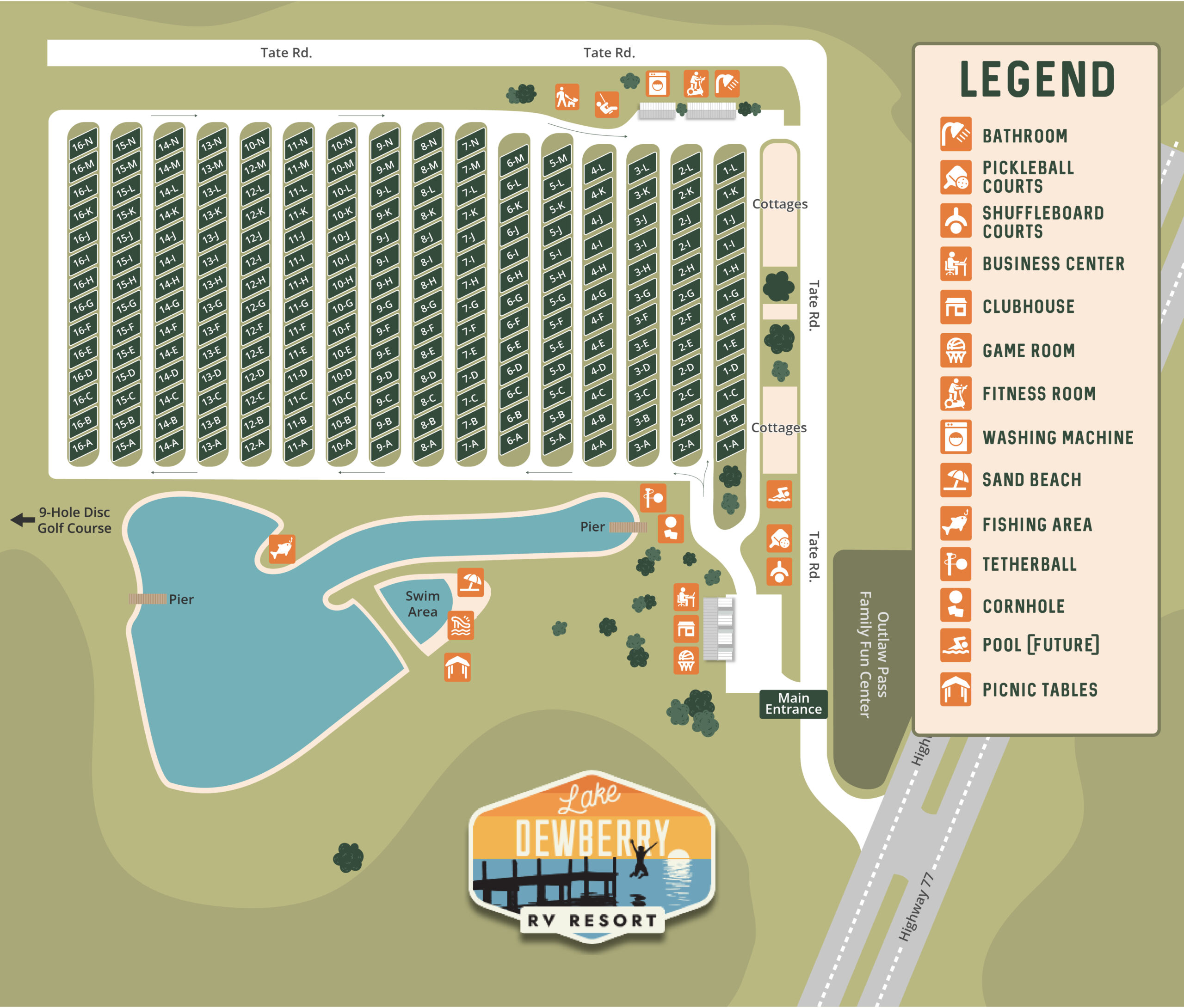 Use Lake Dewberry RV Resort’s interactive campsite map to easily locate your RV site, amenities, and nearby attractions, making your stay smooth and hassle-free.